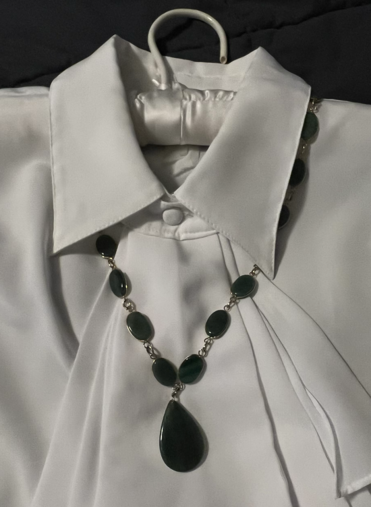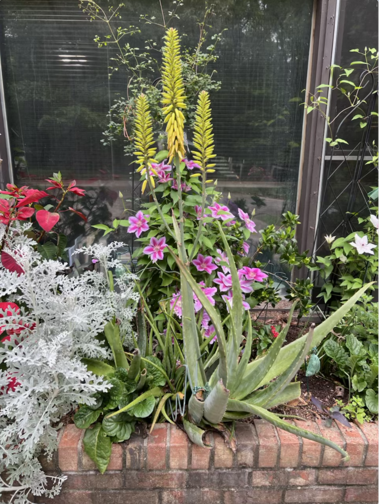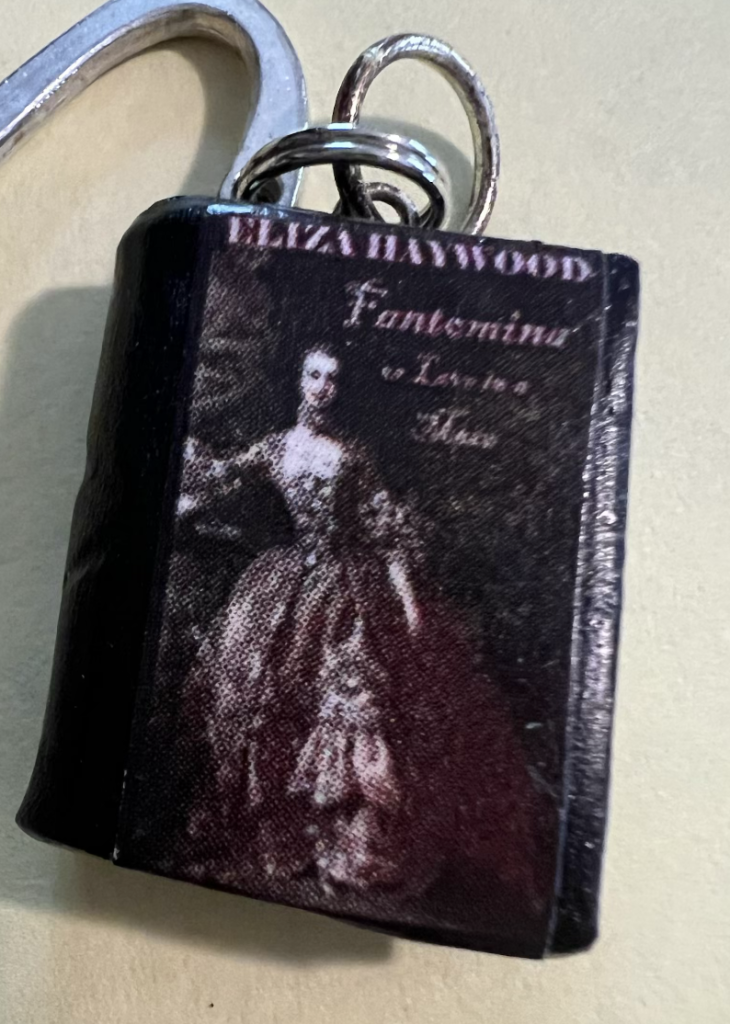 One of my most talented graduate students collected angels, and she gave me one at the time she named her baby Gabriel. It is a beautiful nut or candy dish.These pieces mark two milestones. The bracelet was a gift from students in the first class I taught as a real assistant professor (Rollins College). They were in a required, not highly popular Brit.Lit. I class. Most had waited until their senior year to take it and were known as a rowdy bunch. So I got the class. They styled themselves as “my yahoos,” and I loved them and they loved me (I think). The pendant was from a few students in my first NEH Seminar, taught in a former cell in the old Public Record Office on Chancery Lane, London. We were careful not to let the stone door close.These bookmarks celebrate important events. From graduate students, years after they graduated: A remarkable portrait of Eliza Haywood, a woman novelist I brought to wide attention, and an encouraging, leather retirement gift.A closer look at Eliza Haywood, a woman novelist I brought to wide attention, and her beautiful dress.A student who wrote a brilliant dissertation on the early career of Dorothy Parker, gave me this beautiful necklace on the date she received her degree.A brick window box beside of our house is a space for experiments with beautiful plants often found by my husband.. In addition to dusty miller and impatiens, there is the rare, blooming aloe plant. I always had a student worker, and this cup was the gift of one of the very best. In her interview, she explained that her experience working at Chuckie Cheese was good preparation for my job. It was. She also worked for the Instructional Media Group lab that reported to my husband. Like this cup, she was creative and unpredictable.
