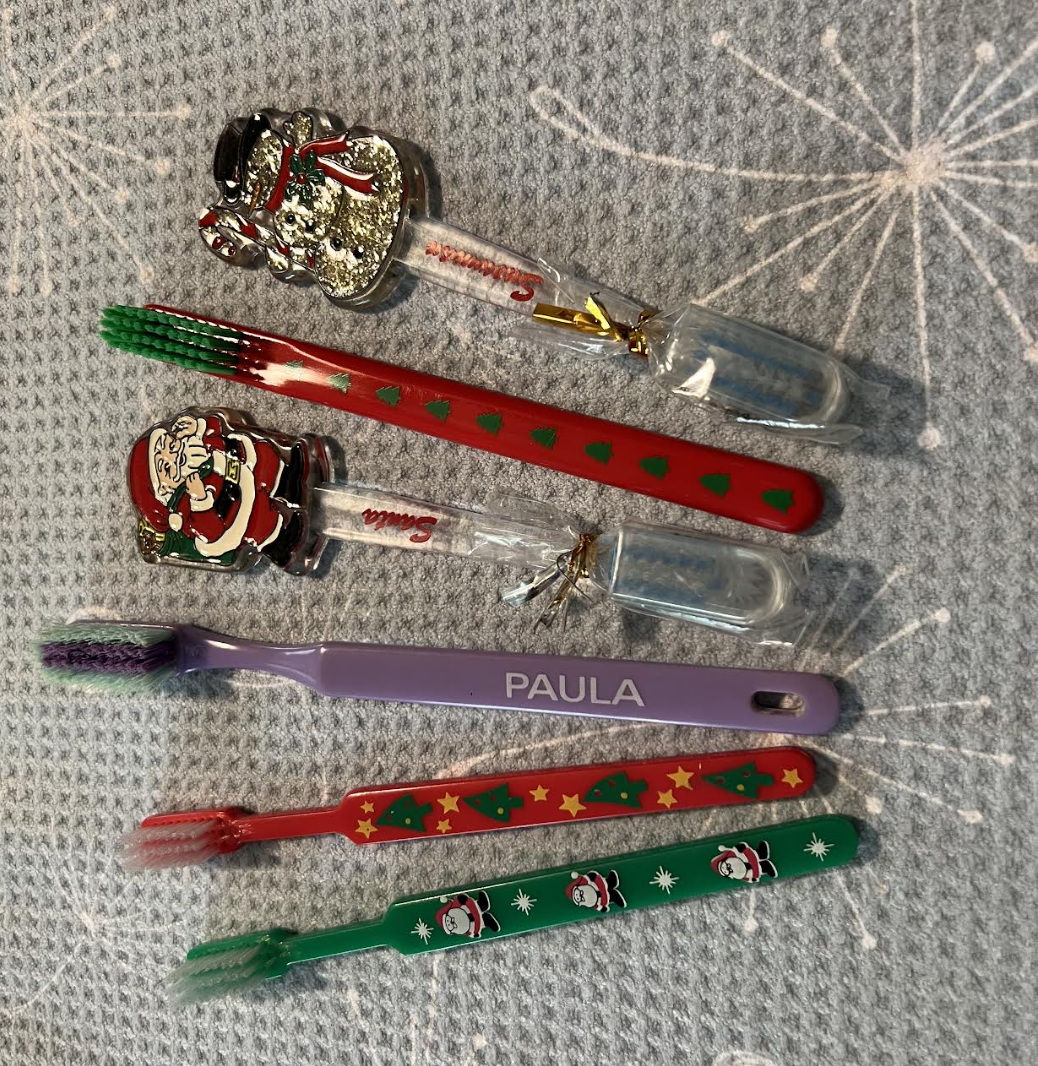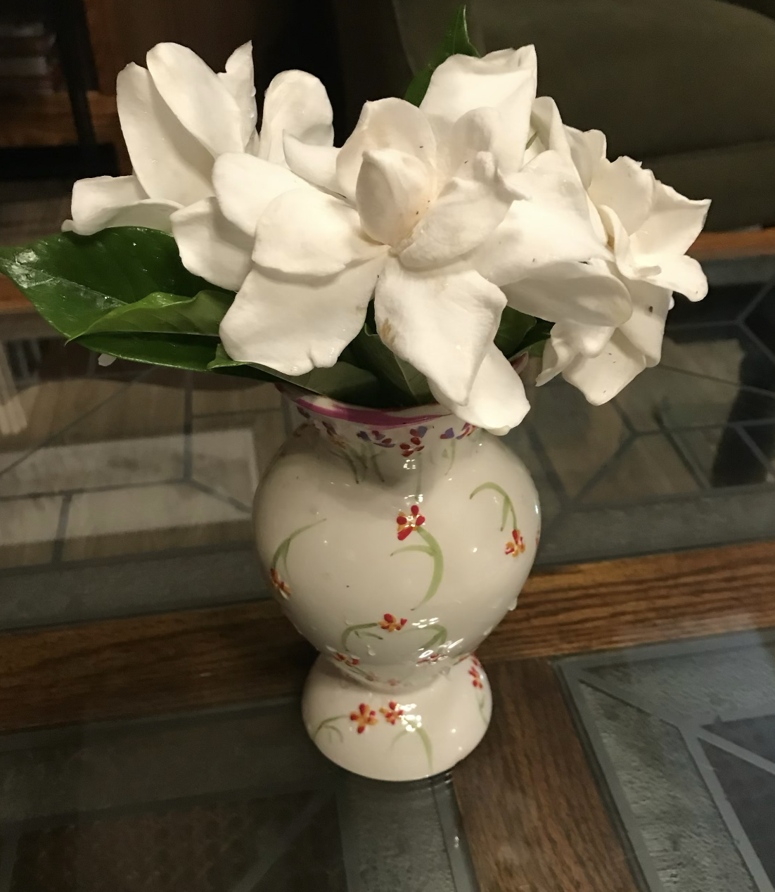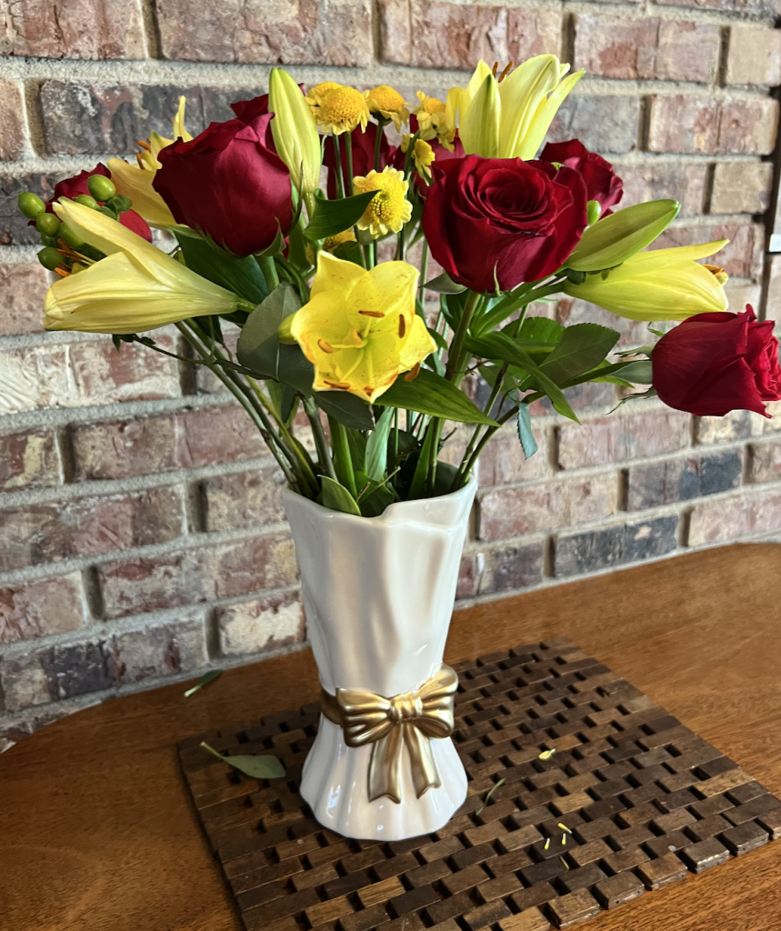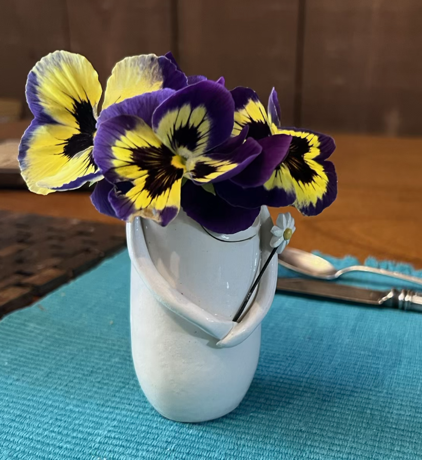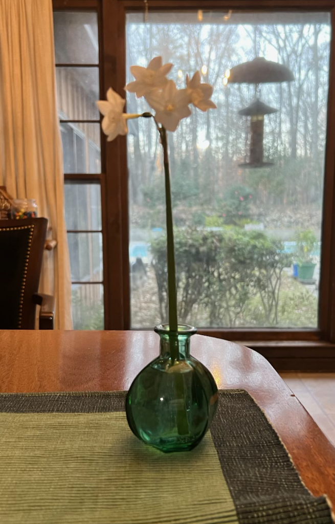 A recently retired friend took a class in making plates like this for parties. And she gave me one of her first.Many of the gift vases suggest that the giver knew the kinds of flowers I grew, loved, and put in the vases.When I moved to Auburn University with its long growing season, I had a huge office with three big windows. One had perfect morning sun. I began to bring flowers in, and so my students and I felt refreshed, A few gave me beautiful, perfectly shaped vases. These two are still favorites and were given to me by Ph.D. students who trusted me to mentor them although their dissertations were directed by colleagues.In a vase my granddaughter bought in New Zealand when she was briefly living there, are pansies, the flowers my son identified as symbols of friendship.An unusual and favorite vase from my engineer son-in-law.The jade necklace that my jabot always wanted.A single jonquil from one of the bulbs I brought from my mother‘s home when she died.Ever think of toothbrushes as Christmas gifts? They have obviously made very good ones.A cute-as-a-button spring vase given from my engineer, world health granddaughter with perfect flowers picked from the yard.For easy care, we converted flowerbeds intonative plants that need almost no care. This is a Fatsia Japonica, an evergreen plant in bloom that looks tropical, but does well in cold weather. A former student yard helper, who now has his own landscaping business planted ten to go with the two or three I had.Every birthday one of my best friends sends a different kind of gift that she is right to know I will love.A coaster from a set expresses how I always want to be true to myself, and this gift from one of my most creative and free spirited, NEH fellows has always had special meaning for me.This much loved and used book was the gift of my second NEH seminar members. They all signed it.